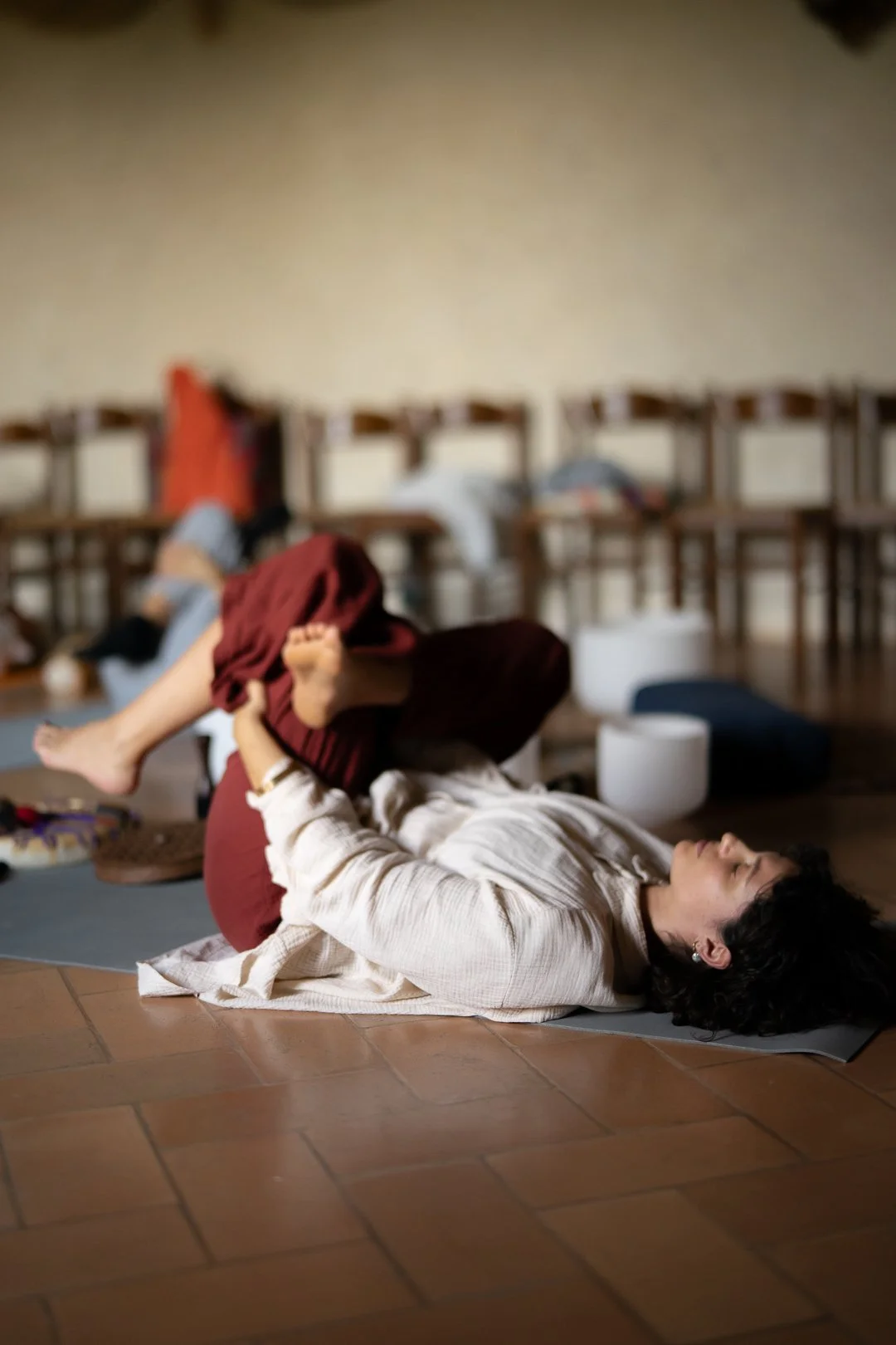 Le pratiche di asana lavorano sul contatto con il corpo, sul senso di radicamento e su un rilascio graduale delle tensioni. Il lavoro con il suono accompagna l’ascolto e l’integrazione, attraverso un uso essenziale della voce, del respiro e della vibrazione.